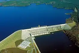 Richard B. Russell Dam is a concrete-gravity and embankment dam located on the Savannah River at the border of South Carolina and Georgia, creating Richard B. Russell Lake. The dam was built by the U.S. Army Corps of Engineers between 1974 and 1985 for the purposes of flood control, hydroelectricity, recreation, additional stream flow regulation, water supply, and fish and wildlife management. The concrete structure of the dam spans 1,904 feet (580 m) and rises 210 feet (64 m) above the riverbed, housing a hydro-power plant with an installed 600 megawatts (800,000 hp) capacity. The Richard B. Russell Dam is the final large dam completed by the U.S. Army Corps in the Savannah River Basin and lies 30 miles downstream from the Hartwell Dam (1962) and 37 miles (60 km) upstream from the J. Strom Thurmond Dam (1954).[1]