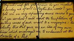 On 30 December 1787, Burns wrote to Brown saying: "Do you recollect a Sunday we spent in Eglinton woods? You told me, on my repeating some verses to you, that you wondered I could resist the temptation of sending verses of such merit to a magazine: 'twas actually this that gave me an idea of my own pieces which encouraged me to endeavour at the character of a Poet." Adding that : "Almighty Love still "reigns and revels" in my bosom; and I am at this moment ready to hang myself for a young Edinr. Widow." The widow, as he puts it, was Clarinda.[1] This letter provides clues as to when Burns's regular marriage to Jean Armour took place.