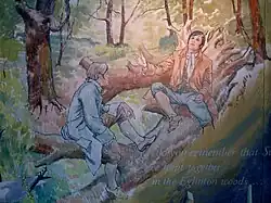 Robert Burns lived in Irvine during the years 1781–1782, at the age of 23, (1759–1796) for a period of around 9 months,[8][9] whilst learning the craft of flax-dressing from his mother's half-brother, Alexander Peacock, working at the heckling shop in the Glasgow Vennel.[10] During this time he made a number of acquaintances, befriended several locals and in particular struck up a lasting friendship with Richard Brown, with whom he took regular walks into the Eglinton Woods via the old Irvine-to-Kilwinning toll road and the Drukken or Drucken (Drunken)[11] Steps over the Red Burn and back via the site of Saint Brides or Bryde's Well at Stanecastle.[12]