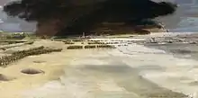 After completing his Dunkirk painting and a number of other short-term commissions for WAAC, Eurich was given a full-time commission to paint Admiralty subjects. This commission lasted from 1941 to 1945 during which time he painted, sometimes, epic reconstructions of battle scenes, depictions of survival stories and also simpler paintings of ships and boats.[4] Some of these works were based on locations and vessels Eurich was familiar with, such as his paintings of British fishing boats and of naval actions off the south coast of England. To ensure accuracy, Eurich made several trips on destroyers patrolling the Straits of Dover during the war. Other paintings were based on photographs and eyewitness accounts and some were wholly works of imagination.[2] This last category included Survivors From a Torpedoed Ship showing exhausted men clinging to the upturned hull of their lifeboat.[5] Although the painting was greatly praised, by Winston Churchill among others, WAAC quickly withdrew it from public display fearing it would adversely affect recruitment to the Merchant Navy.[2] Eurich painted reconstructions of British Commando raids on Vaagso, Bruneval and Dieppe. For the Dieppe raid, Eurich was given access to the operations room for the attack and listened to the British radio communications as events developed.[2][6] During the war, Eurich also painted scenes representing the D-Day landings, the Battle of Salerno, the wreck of the Tirpitz and air attacks on a convoy.[4] In total during the war, Eurich completed some 34 oil paintings and one drawing for WAAC.[2]