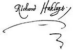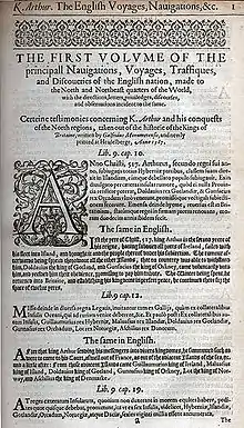 Richard Hakluyt (/ˈhæklʊt, ˈhæklət, ˈhækəlwɪt/;[1] 1553 – 23 November 1616) was an English writer. He is known for promoting the English colonization of North America through his works, notably Divers Voyages Touching the Discoverie of America (1582) and The Principal Navigations, Voyages, Traffiques and Discoveries of the English Nation (1589–1600).