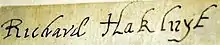 A manuscript signature of Hakluyt from the front flyleaf of the above work