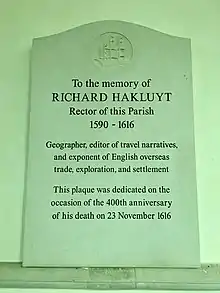 A 1910 memorial tablet to Hakluyt in Bristol Cathedral