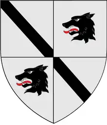 Arms of Hough: Quarterly 1 and 4 Argent, a bend Sable, 2 and 3 Argent, a wolf's head, erased, Sable