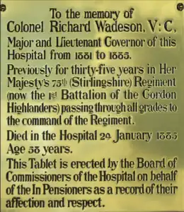 After the mutiny campaign, Wadeson served as adjutant of the 75th Regiment until December 1864 when – still with the regiment – he was promoted to captain in December 1864 and major in July 1872.[1] In December 1875 he was made a lieutenant-colonel[4] and appointed to the command of the 75th, becoming only the third regimental commander in the British Army to start his military career in the ranks.[5] After promotion to brevet colonel in December 1880, he became Lieutenant Governor of the Royal Hospital Chelsea in March 1881, where he died in office on 24 January 1885 aged 58.[1] He was buried with military honours at Brompton Cemetery, attended by many Chelsea Pensioners.[2] There is a commemorative plaque to him at the Royal Hospital.