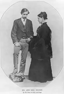 On June 3, 1874, Gilder married a daughter of Commodore George Coleman De Kay, Helena de Kay Gilder (1846–1916).[2] Gilder met his wife, Helena de Kay Gilder, in May 1872 while she was visiting the offices of Scribner's Monthly, where Richard Watson Gilder was at the time working as an editor. About a year and a half later, in February 1874, Helena and Richard became engaged. Richard Watson Gilder and Helena de Kay Gilder are known to have kept a lengthy correspondence with each other via letter over the course of their marriage. Helena de Kay Gilder is also known to be the subject of love poems written by Richard Watson Gilder, and they partnered together on some of his books, with her working as the illustrator, such as in Two Worlds and Other Poems (1891). She was a talented painter and a founder of the Art Students League and Society of American Artists. She also modeled for, and was an unrequited love of, the painter Winslow Homer.[7] Gilder and de Kay were the models for the characters Thomas and Augusta Hudson in Wallace Stegner's Pulitzer-prize winning novel, Angle of Repose. Their son, Rodman de Kay Gilder (1877–1953), became an author and married Louise Comfort Tiffany, a daughter of Louis Comfort Tiffany. Their daughter, Rosamond Gilder, was a notable theater critic.[8] A celebrated plaster sculpture of the family by Augustus Saint-Gaudens is owned by the Metropolitan Museum of Art.[9] The Berkshires summer home of Helena de Kay and Richard Watson Gilder is being turned into a museum.[10]
