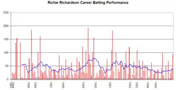 Richardson played 86 Test matches until 1995 scoring 5,949 runs and 16 centuries. He was very successful against Australia, hitting 9 centuries against them, and scored his highest score of 194 against India in Guyana in 1989. He also played 224 One Day Internationals including 3 World Cups. As well he was named, in 1992, one of Wisden's Cricketers of the Year.[2][13]