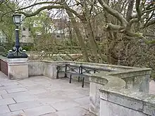 On 10 March 1859 the last subscriber to the main tontine died, having for over five years received the full £800 per annum set aside for subscribers to the first tontine, and with the death of its last member the scheme expired.[27][n 2] On 25 March 1859 Richmond Bridge became toll-free.[28] A large procession made its way to the bridge, where a team of labourers symbolically removed toll gates from their hinges.[28] The toll houses were demolished, replaced by seating in 1868; investment income from the revenue accumulated during the 83 years the tolls had been charged was sufficient to pay for the bridge's maintenance.[14]