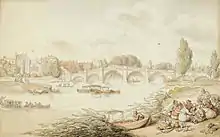 There was no formal opening ceremony, and little initial recorded public reaction.[23] However, the bridge soon became much admired for its design; an article in The London Magazine in 1779 said that the bridge was "a simple, yet elegant structure, and, from its happy situation, is ... one of the most beautiful ornaments of the river ... from whatever point of view the bridge is beheld, it presents the spectator with one of the richest landscapes nature and art ever produced by their joint efforts, and connoisseurs in painting will instantly be reminded of some of the best performances of Claude Lorraine".[24] James Paine proudly illustrated it among the designs in the second volume of his Plans, Elevations, and Sections of Noblemen and Gentlemen's Houses, 1783.[25] Richmond Bridge was the subject of paintings by many leading artists, including Thomas Rowlandson, John Constable and local resident J. M. W. Turner.[14]