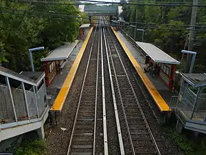 There are two side platforms and the station is orange color with the south overpass appearing to be an addition during a renovation. Because of the short platform, only the first 3 cars in the direction of the train traveling can be platformed here.[21] Mill Creek, which leads to the Arthur Kill, passes beneath part of the platform,[22] and travels underneath the SIR through a culvert.[20]
