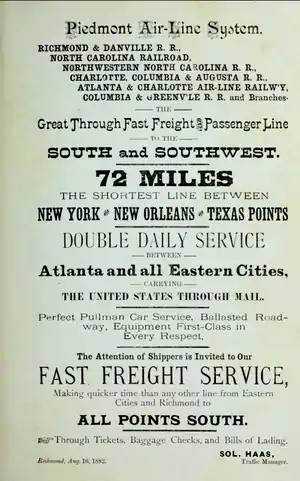 - ↑ Piedmont Air-Line System (1882). "Piedmont Air-Line System (advertisement)". J.H. Chataigne. Retrieved January 12, 2014.