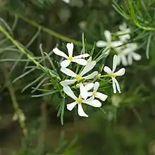 Ricinocarpos tuberculatus is an erect, monoecious or dioecious shrub or small tree that typically grows to a height of up to 4 m (13 ft), its young branchlets glabrous. The leaves are linear, 10–25 mm (0.39–0.98 in) long and 0.8–1.3 mm (0.031–0.051 in) wide with the edges curved under, on a petiole 1–3 mm (0.039–0.118 in) long. The upper surface of the leaves is glabrous and the lower surface is not visible, apart from the midvein. The flowers are arranged on the ends of branchlets in an umbel with either 2 to 7 male flowers or a single female flower surrounded by up to 5 male flowers. Each flower has 5 sepals joined at the base and 5 white petals twice as long as the sepals. Male flowers are on a slender pedicel 12–22 mm (0.47–0.87 in) long, the sepal lobes 1.5–2.5 mm (0.059–0.098 in) long and 1.0–1.5 mm (0.039–0.059 in) wide. The petals of male flowers are 10–12 mm (0.39–0.47 in) long and 2.5–4 mm (0.098–0.157 in) wide and there are about 30 stamens in a central column. Female flowers are on a stout pedicel 5–10 mm (0.20–0.39 in) long, the sepal lobes 1.2–2.2 mm (0.047–0.087 in) long and 0.8–1 mm (0.031–0.039 in) wide, the petals 10–12 mm (0.39–0.47 in) long and 3–4 mm (0.12–0.16 in) wide. Flowering has been observed in January, March, April and July and in October and November, and the fruit is an elliptic capsule, 10–12 mm (0.39–0.47 in) long and 7–8 mm (0.28–0.31 in) wide.[2][3]