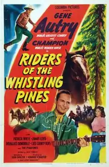 Riders of the Whistling Pines is a 1949 American Western film directed by John English and starring Gene Autry, Patricia Barry, and Jimmy Lloyd. Written by Jack Townley, the film is about a gang of outlaws who are destroying the timberland and who frame a singing cowboy on a cattle-poisoning charge, setting him up for murder.[1]