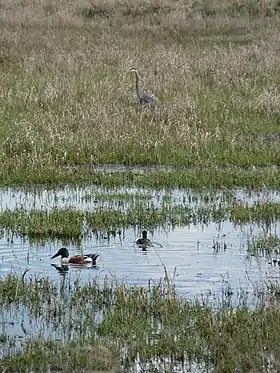 Stately sandhill cranes, shorebirds, Tundra swan, and a great variety of songbirds[8] stop at the refuge during spring and fall migrations.[7] Some bird species such as mallards, canada geese, great blue herons, pheasant, ruffed grouse, barn owl, great horned owl, bald eagles, ospreys and red-tailed hawks are year-round residents that nest on the refuge. Black-tailed deer and cougars are the largest mammals on the refuge. Smaller mammal species such as coyote, red fox, raccoon, skunk, porcupine, bobcat, beaver, mink, river otter, muskrat, badger and brush rabbits are occasionally seen.[9]