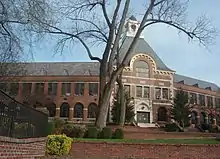 The campus includes one central building, which, along with the original gym, was completed in 1919 at a total cost of $285,000 (equivalent to $4.8 million in 2022). The building features brick walls, a slate roof and other stone features.[5] The building was planned to be opened at an earlier date but it was postponed because of World War I.[6] The building was designed by the architectural firm of Tracy and Swartwout, which also designed the Missouri State Capitol building.[7]