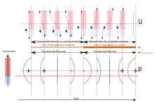 The sound comes from a standing wave whose wavelength is about twice the length of the tube, giving the fundamental frequency. Lord Rayleigh, in his book, gave the correct explanation of how the sound is stimulated.[7] The flow of air past the gauze is a combination of two motions. There is a uniform upwards motion of the air due to a convection current resulting from the gauze heating up the air. Superimposed on this is the motion due to the sound wave.