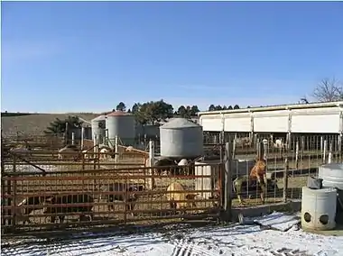Simple structures originally developed in Canada, built at low cost, approximately a US$4 reduction per pig. These structures allow for low-odor, high ventilation, but in colder temperate zones, hoop buildings present challenges for producers to overcome, including proper bedding and disease management.[7] They are used by organic and conventional producers alike to manage large fluctuations of pig flow numbers for larger systems.[8] Traditional barn structures, with access to both indoor and outdoor environments are also common systems for producers.