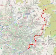 Most of the river's catchment lies on the western flank of the Pennines. The named river starts as compensation flow (that is, a guaranteed minimum discharge[3]) from Readycon Dean Reservoir in the moors above Denshaw. The source is a little further north, just over the county border in West Yorkshire, close to the Pennine Way. The highest point of the catchment is Greater Manchester's highest point at Black Chew Head.