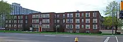 All four buildings are 2-1/2 to four stories tall, and are constructed with steel framing, cinder block walls faced with red brick, and flat roofs. The complex contains 178 apartments, varying in size from 2-1/2 room studio apartments to 5 room full apartments.[2] Building number one is U-shaped, with the base of the U fronting on Jefferson. It is 3+1⁄2 stories tall, with a half-story basement level. The facade has a central section, containing the entrance and two flanking windows, which projects slightly from the main section of the building. The entrance is set in a pilaster with a segmental pediment wood frame.[2] Building two forms a long undulating line behind the southwest corner of building one, extending almost to the river. Building three and four are separated from building two by a long courtyard, and zigzag toward the river from the southeast corner of building one.[2]