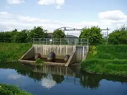 The three parallel channels, with the A18 running to the south of the Hatfield Waste Drain, arrive at Pilfrey Bridge, where they are joined by the South Engine Drain and the Folly Drain.[18] The River Torne used to continue eastwards to a sluice at Althorpe, but the sluice is no more and the channel drains in the reverse direction. The South Engine Drain, which was built as part of improvements made in 1795, used to pass under the Torne and the road through another grade II listed syphon, which dates from 1813.[8] The syphon is now redundant, since the channels have been connected together. Three parallel channels, known as the Three Rivers, flow to the north east, passing under the Doncaster to Scunthorpe railway, to arrive at Keadby pumping station.[18]