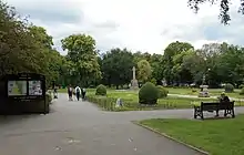 Within the park is a memorial to soldiers killed in the Boer War (1899-1902) which consists of a bronze statue of a soldier on a granite plinth. This was first created in 1905, and was originally located in Bond Gate in the town centre, but was moved to the park in 1967. In 2006 the original statue was stolen, and it was replaced by an identical one in 2008. The memorial is grade II listed.[5]