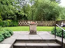 The original chapel yard had no path and was covered by grass. Until the early 20th century the chapel was heavily covered in Ivy and the gate was kept locked and entry was accompanied if no service was being conducted, during which the service was conducted with windows open in summer.[31] Gravestones are a variety of types, with the earlier ones being slabs raised by stone sides, many of the raised grave slabs had to be lowered to ground level due to the supports sinking by the mid 20th century. Some graves at ground level were surrounded by decorative wrought iron railings, the ironwork was removed in World War II by government for use in munitions production.[9] There are graves here with monuments to the Pilkingtons, Andrews, and Cromptons, Lords of the Manor of Rivington;[32] the Shaws, whose ancestry can be traced to 1190;[11] the Ormrods; Samuel Oldknow "of Nottingham, late of Anderton", who died on 7 August 1759 and whose son, Samuel Oldknow, was a factory owner[3] and the first Mayor of Bolton, C. J. Darbyshire.[33] A plaque commemorates Walt Whitman, celebrated on 31 May 1913 by the minister, Samuel Thompson and the Eagle Street College.[34][35]