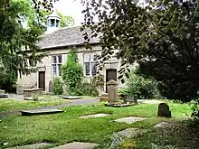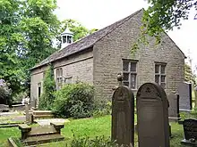 The chapel is a plain structure, originally with a Thatched roof which remained repaired as late as 1790.[25] The building is of local gritstone with quoins at the corners and now has a slate roof.[26] It has a small, hexagonal bellcote on the west gable, the bell is recorded as being purchased in 1876.[27] The side walls have two cross-windows with rectangular panes of glass and the gable walls have windows with small diamond-latticed panes of glass. On the south side are two doorways with chamfered surrounds; over one door is a lintel dated 1703. At the north-west corner is a two-storey wing with a tall chimney stack, which was the school house.[3] The building is surrounded by a drystone wall and the chapel's original bell and its cast iron gates dating to 1816 survive.[26][9]
