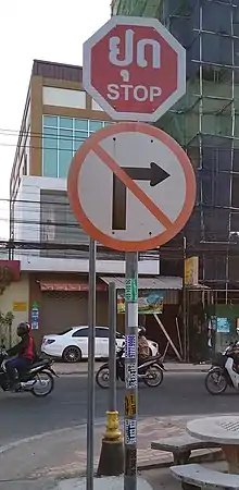 Road signs in Laos generally follow those used in most European countries as set out in the Vienna Convention on Road Signs and Signals. Despite this, the country itself has never signed the Vienna Convention on Road Signs and Signal. Inscriptions on traffic signs are in Lao, the national language of Laos. However, English is also used for stop and important public places such as tourist attractions, airports, railway stations, and immigration checkpoints. Both Lao and English are used on directional signage.