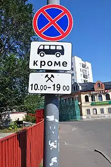 In June 2018, in connection with the preparations for the 2018 FIFA World Cup in Russia, a new prohibition road sign "No buses allowed" (Russian: Движение автобусов запрещено) was introduced. This sign was used as a temporary sign from June 1 to July 17, 2018 during the 2018 FIFA World Cup and after the end of the World Cup, the sign was retired.[12][13] However, from March 1, 2023, this sign was reintroduced, but now on a permanent basis.[14] This is due to changes in the Rules of the Road in Russia that came into force on March 1, 2023, in particular, the speed limit for buses was introduced.[15]