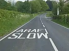 Bilingual signs in Wales were permitted by special authorisation after 1965. In 1972 the Bowen Committee recommended that they should be provided systematically throughout Wales. Throughout Wales, instructions for drivers appear on the road itself. One of the most common painted instructions is araf – slow.