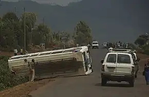 In 2021, the Federal Police Commission report issued that the country experienced 15,034 road accidents during the fiscal year that ended on 7 July 2021, leaving 4,161 people dead. The accidents left 5,763 injuries, while 5,110 others sustained minor injuries. Police also recorded 31,643 accidents that caused property damage worth more than 2.28 million birr.[6] The World Health Organization (WHO) reported in 2013 that Ethiopia is amongst country to have the highest road accident, estimated about 4,984.3 deaths per 100,000 vehicles per year, compared to 574 across Sub-Saharan countries. In addition, the number of people who are victims of car crashes are about 30 times higher than of the United States.[1]