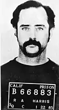 Robert spent four months in juvenile hall at age 13 for stealing a car.[2] During his time at the juvenile detention centre, Harris was repeatedly raped.[4] In 1967, Evelyn abandoned Robert, then 14, in Sacramento and left him to fend for himself.[2][3][5] After making his way to Oklahoma to live with his brother and sister, he stole a car and was subsequently arrested in Florida.[2][6] He spent the next three years in the Florida juvenile detention system, but when he turned 19, the system could no longer keep him, and he was sent to Chula Vista, California.[6] In June 1973 Harris married, and the couple had a son, Robert, Jr., born in October 1974.[7] In 1975 while living in a trailer park in Imperial County,[2] Harris beat his brother Ken’s roommate, James Wheeler, to death, claiming he did so to protect the victim's wife; however, it was later determined that he beat the victim without provocation.[5] He was convicted of voluntary manslaughter and imprisoned in San Luis Obispo;[2] during his imprisonment Harris' wife filed for divorce.[7] Harris was paroled in January 1978.[6]