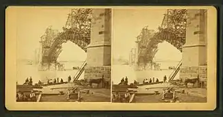 Benecke photographed numerous places in St. Louis and its vicinity throughout his career, including steamboats, bridges, streets, and panoramic views. One of his most popular stereo card collections featured the Eads Bridge in its various phases of construction.[8] A panoramic view of St. Louis exhibited by Benecke at the 1870 St. Louis Fair was widely praised.[1] In 1883, he provided several artotypes for a guide and history of Tower Grove Park.[9]