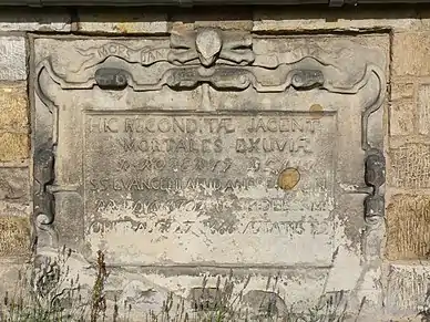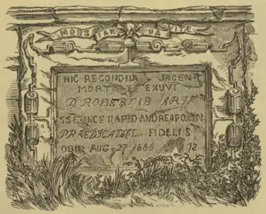 Robert Blairs Grave, St Fillans, Aberdour. The scroll that surmounts it bears the inscription, Mors Janua Vitae — Death is the Gate of Life; and the simple epitaph when translated runs thus : "Here lie the mortal remains of the Reverend Robert Blair, a most faithful preacher of the Gospel at St. Andrews. He died on the 27th of August 1666, in the 73d year of his age."[5]
