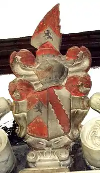 The monument has a white marble surround with a broken segmental pediment with rolled terminals and with festoons or swags over, surmounted by a free-carved and painted shield and crest. The entablature projects over a pair of free Ionian columns, which rest below on a black marble corbel-table supported beneath by white grooved and rolled foliate consoles. Between the columns the inscription appears on a large black marble tablet framed by white marble moulding with an applied cherub's face with wings at the top, and a small heraldic shield indented at each corner. Beneath the corbel-table, between the consoles is inset a black marble stone inscribed "Memoria justi benedicta", and below this is inset a pair of fruit-cluster festoons suspended from hanging linen swags, carved in high relief. The main inscription, in a neat cursive script in Latin, remembers Sir Robert, follows with a eulogy for Dame Elizabeth, and mentions her parentage and her children, "e quibus Maria sola superstes lugens curavit hac apponenda marmori".[41] The monument evidently belongs to the same moment as the funeral oration and Parkhurst's Life of Dame Elizabeth.