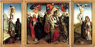 A corpus of work is attached to the unidentified "Master of Flémalle,"[4][5] so named in the 19th century after three religious panels said to have come from a monastery in Flémalle. They are each assumed to be wings of triptychs or polyptychs, and are the Virgin and Child with a Firescreen now in London, a panel fragment with the Thief on the Cross in Frankfurt, and the Brussels version of the Mérode Altarpiece.[6]