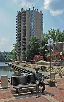 Simon returned to live in an apartment near Lake Anne in Reston in 1993[10] and helped celebrate Reston's 40th birthday in 2004.[11] In that same year a bronze statue of Simon was placed on a park bench in Washington Plaza on Lake Anne, the original heart of the community he built.[3][11]