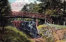 One of Mount Gretna's main attractions was a narrow gauge railway to the top of Governor Dick Mountain, built by Coleman in twelve weeks in the spring of 1889.[5][2] This train was unique for several reasons—its rail was only 2 feet (0.61 m) wide and it was the only track in the country to run 4-4-0 type locomotives.[2] Coleman ordered three of these scaled-down locomotives from the Baldwin Locomotive Works in Philadelphia.[2] As one historian noted, "[Coleman] wanted a choo-choo, and he had the money to buy one."[2] The Governor Dick narrow gauge was "Coleman's greatest pride" and an immediate success; it attracted 36,000 visitors in its first season.[2] That summer, Coleman entertained a large group of Trinity College alumni at Mount Gretna.[22][23]