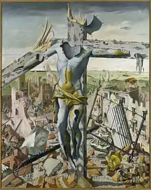 Blyth was born in the Newlands area of Glasgow and studied at the Glasgow School of Art from 1934 to 1939.[3][4] Blyth joined the Royal Army Medical Corps in 1941 and served with them until the end of the Second World War. During the war Blyth continued to paint and sketch, whilst on active service in France, Belgium, the Netherlands and Germany.[5] Four paintings from this period were acquired by the War Artists' Advisory Committee.[6] Towards the end of the conflict Blyth's unit, 157 Ambulance, was based in Hamburg much of which had been devastated by RAF bombing raids in 1943. Blyth used the background of a destroyed city in his most famous painting, In the Image of Man. Painted after the war ended the painting's title parodies the Judeo-Christian concept of man made in the image of God and shows a city in ruins behind a bomb damaged crucifix.[7] In 1945 Blyth won the Guthrie Award from the Royal Scottish Academy.[5][4] In 1946 he painted Existence Precarious, a self-portrait as a soldier in a trench, which is now in the National Gallery of Scotland. Also in 1946 he began teaching at the Edinburgh School of Art and became an artist in residence at Hospitalfield House. In 1954 he moved to Aberdeen to take a post at Gray's School of Art, where he became head of drawing in 1960, a post he maintained until his death in 1970.[8][9] The Scottish Arts Council organised a memorial exhibition to Blyth which toured Scotland during 1972. [10]