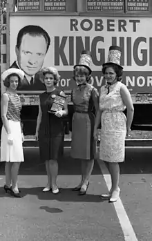 High opponents tried to arouse segregationist white sentiments against him as the 'black' candidate. 'Throwaways', handouts with no attributed source, were circulated. One showed a pregnant black woman in a rocker, with the caption, "I went all the way with Robert King High". Another had pictures of Rev. Martin Luther King Jr., Robert Kennedy, and Robert King High, and was labeled, "A poker hand one joker and a pair of Kings." A photograph of High playing pickup football with some black newsboys was widely circulated.[32]