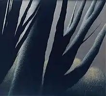The paintings and prints that followed, executed either in black and white or in color, include numerous variations in the shape, size, and placement of trees. Large Trees at Dusk exhibits the beginning of Kipniss's purification of tree forms, his use of closely related hues in a subdued or dark range, and the sense of solitude characteristic of his mature output. Of the paintings and prints since 1962, hundreds show the interplay of tree trunks, focusing on close or more distance views.[23]