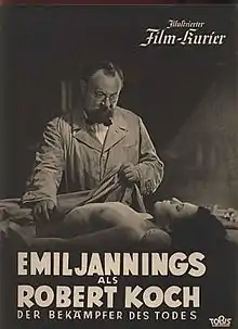 Robert Koch (German title: Robert Koch, der Bekämpfer des Todes) is a 1939 Nazi propaganda film directed by Hans Steinhoff and starring Emil Jannings, Werner Krauss and Viktoria von Ballasko.[1] The film was a biopic of the German pioneering microbiologist Robert Koch (1843–1910). It was shot at the Johannisthal Studios in Berlin and premiered at the city's Ufa-Palast am Zoo. The film was made by the Tobis Film company, and was also distributed in the United States by the largest German studio UFA.
