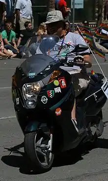 Lilligren on a motorcycle during a Minneapolis Pride Parade in 2009