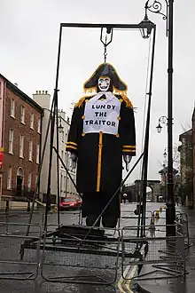 Lundy is reviled in Ulster loyalism as a traitor to this day, and is burned in effigy during the celebrations to mark the anniversary of the shutting of the gates of Derry in 1688.[16] Much like Judas, his name has become a byword for "traitor" among unionists and loyalists.[17] Ian Paisley regularly denounced people, including Margaret Thatcher, Terence O'Neill and David Trimble, as "Lundies".