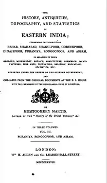 Richard Wellesley, 1st Marquess Wellesley entrusted Martin with the preparation of his papers for publication, as The Marquis of Wellesley's Indian Despatches, 5 vols. 1836, and The Marquis of Wellesley's Spanish Despatches, 1840. For some months in 1833–4 he was engaged on the Taxation of the British Empire, working mainly in the library of the House of Commons. He next turned to the records of East India House, and brought out his History of the Antiquities of Eastern India (3 vols.) in 1838.[2]