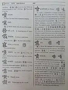 - Part I, Vol. III - Robert Morrison (1823). A Dictionary of the Chinese Language, in Three Parts: Chinese and English, arranged according to the radicals. Macao, China: Printed at the Honorable the East India Company's Press by P.P. Thoms; published and sold by Kingsbury, Parbury, and Allen, Leadenhall Street. p. 910. Retrieved 15 May 2011.
