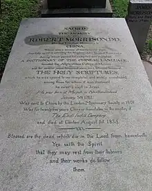 Morrison was buried in the Old Protestant Cemetery in Macau. The inscription on his marker reads: