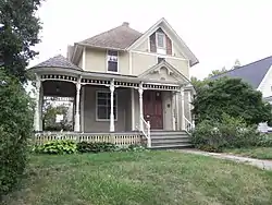 Robert Jones was a postal clerk in Waukesha. The architects Wolf and Waegli designed this house for him and it was built in 1897. It is two stories, with Queen Anne styling in the asymmetric facade, the hip-and-gable roof, the shingle-work in the gable ends, and the wraparound porch. The porch is especially striking, with its sunburst gable and the corner pavilion.[3]