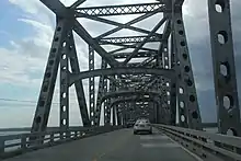 The Robert Opie Norris Jr. Bridge is a truss bridge that spans the Rappahannock River in Virginia, United States and serves as the crossing for State Route 3 over the river between Grey's Point on the Middlesex County side and the town of White Stone in Lancaster County. The span was opened on August 30, 1957, and replaced a ferry service directly West of where the current bridge is located. Commonly known by locals as the White Stone Bridge or Rappahannock River Bridge, this span is a critical crossing between the Lower Middle Peninsula and the Northern Neck as the next closest crossing is over 30 miles (48 km) upstream near Tappahannock. Traffic forced to utilize a detour over the upstream crossing could potentially travel over 90 miles (140 km). The Norris Bridge is 11,237 feet (3,425 m) long,[1] and provides a Mean High Water clearance of 110 feet (34 m) under the center span with a channel depth of over 60 feet (18 m). The bridge is maintained by the Virginia Department of Transportation. When first opened, the bridge was crossed by just over 1,000 vehicles per day, on average. Tolls were removed from the bridge in 1976, and by 1978 the average daily traffic had risen to over 2,500 vehicles per day. By 2006, traffic counts reached 11,309 vehicles per day[2] but shrank to 6,900 Annual Average Daily Traffic in 2017.[3]