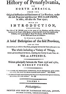 - ↑ Proud, Robert. The History of Pennsylvania in North America from the Original Institution and Settlement of That Province Under the First Proprietor and Governor William Penn, in 1681, till after the Year 1742, Vol. I. Philadelphia, Pennsylvania: Zachariah Poulson, Jr., 1797.